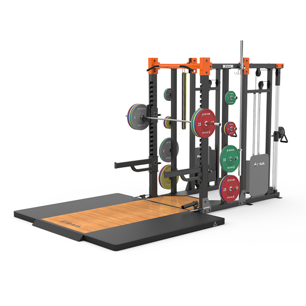 舒華高端綜合框式力量訓練器SH-G8903功能區:杠鈴片整組掛架、萬向炮筒、舉重桿保護架、單杠架、雙杠架、大飛鳥功能。